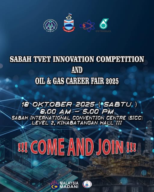 Orang ramai dijemput hadir memeriahkan Sabah TVET Innovation Competition and Oil & Gas Career Fair 2025 yang akan berlangsung pada:
