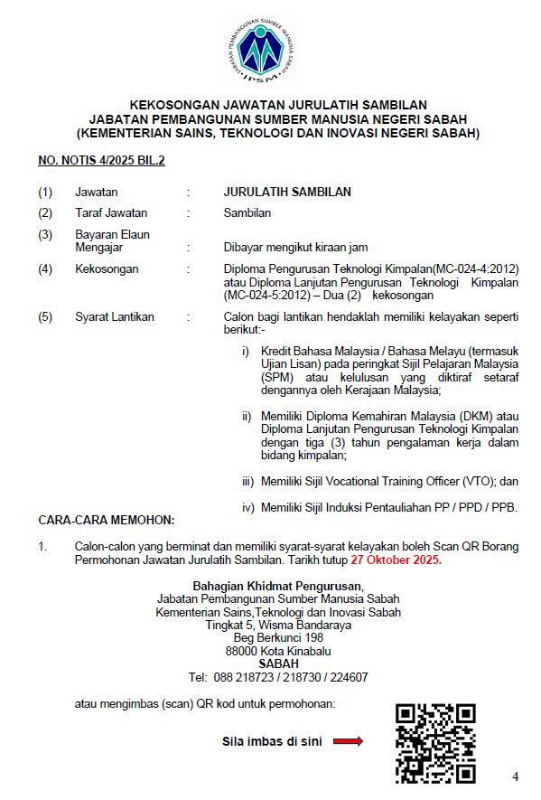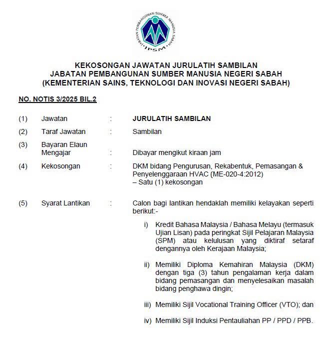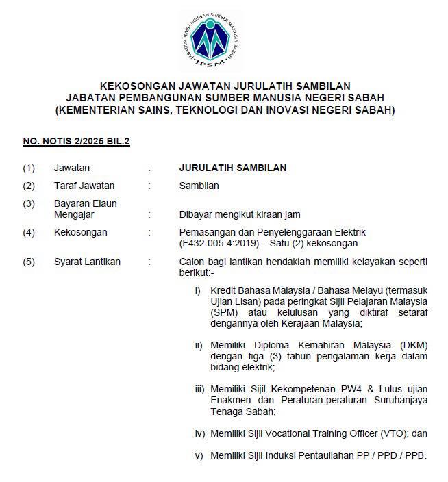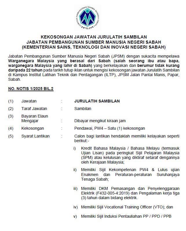 Jabatan Pembangunan Sumber Manusia Negeri Sabah (JPSM) dengan sukacita mempelawa Warganegara Malaysia yang berasal dari Sabah (salah seorang ibu atau bapa, warganegara Malaysia yang lahir di Sabah) yang berkelayakan dan berumur tidak kurang daripada 22 tahun pada tarikh tutup iklan untuk mengisi kekosongan jawatan Jurulatih Sambilan di Kampus Institut Latihan Teknik dan Perdagangan (ILTP), JPSM Jalan Pantai Manis, Papar, Sabah.