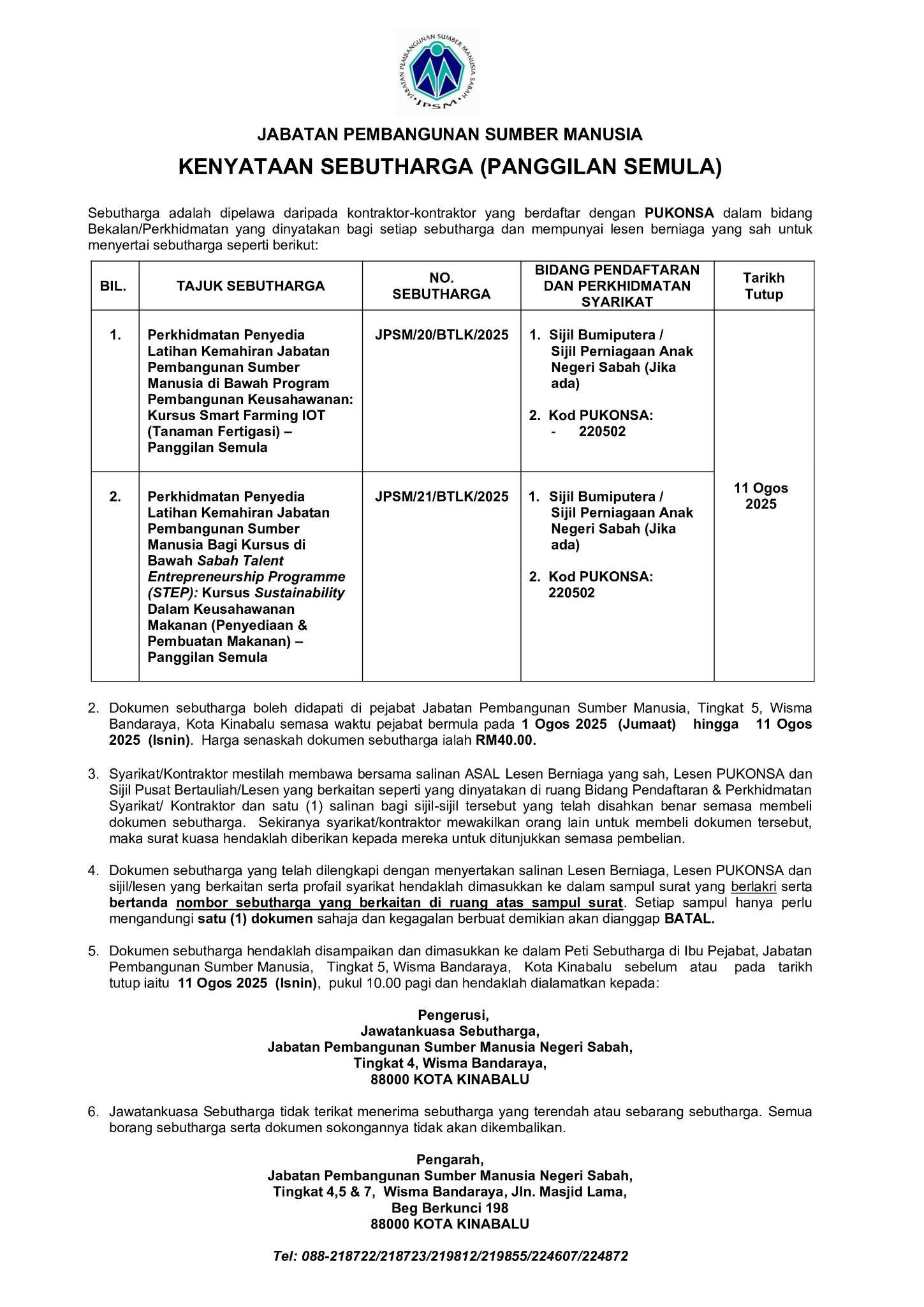 Kenyataan Sebutharga JPSM - 4 Ogos 2025
