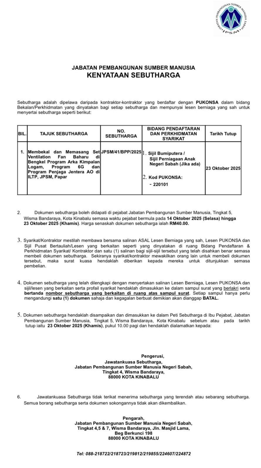 Kenyataan Sebutharga - Membekal dan Memasang Set Ventilan Fan Baharu di ILTP Papar