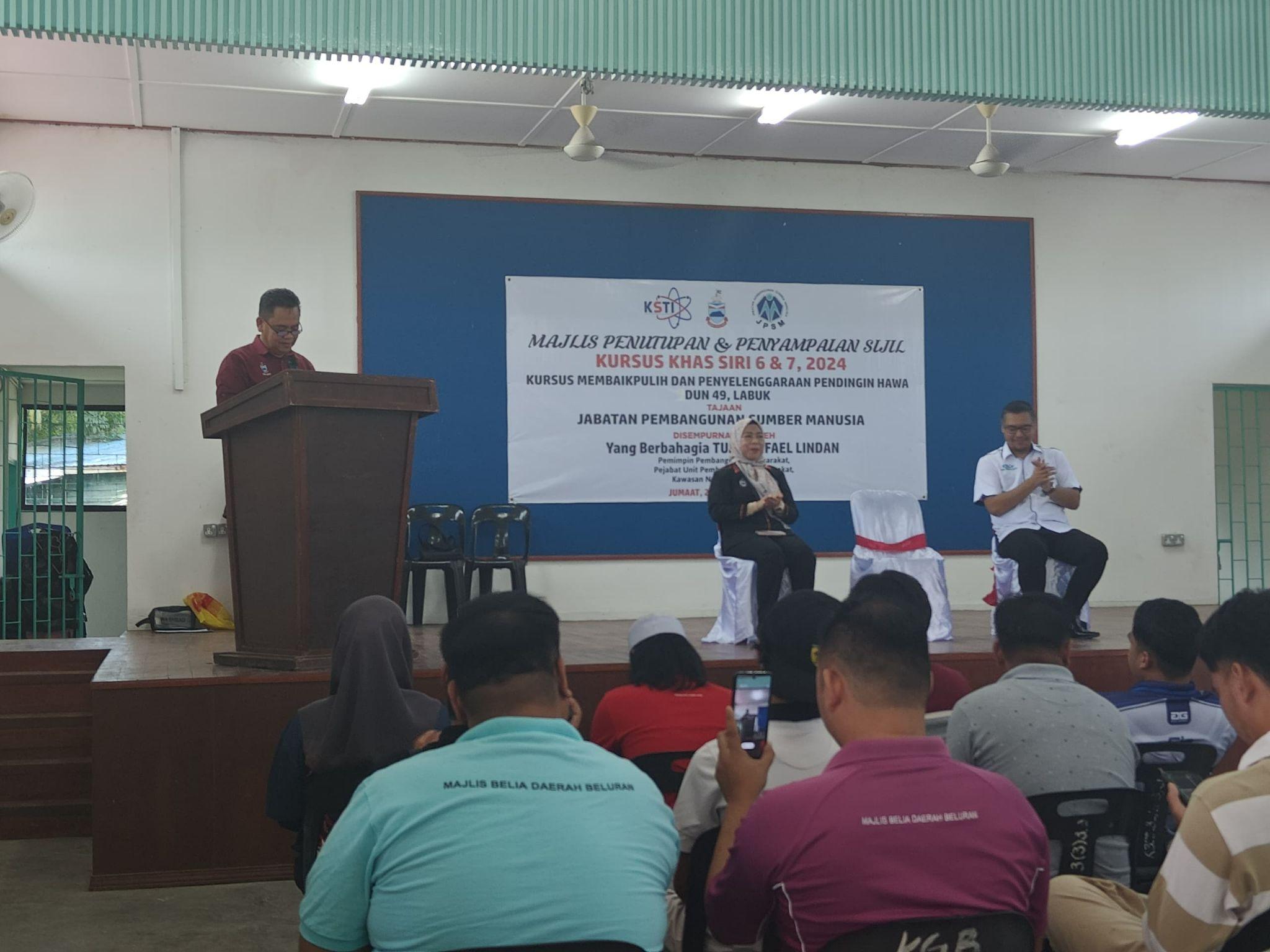 Majlis Perasmian Penutupan dan Penyampaian Sijil kepada 20 perserta Kursus Asas Membaikpulih dan Penyelenggaraan Pendingin Hawa disempurnakan oleh Tuan Rafael Lindan, Pemimpin Pembangunan Masyarakat N.49 Labuk.