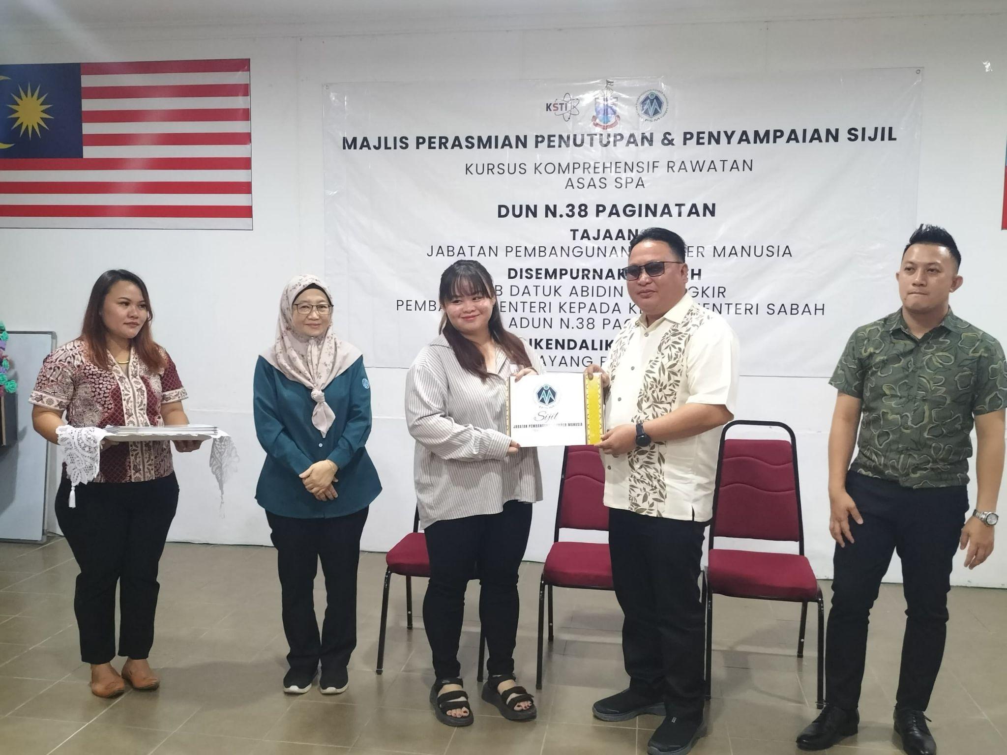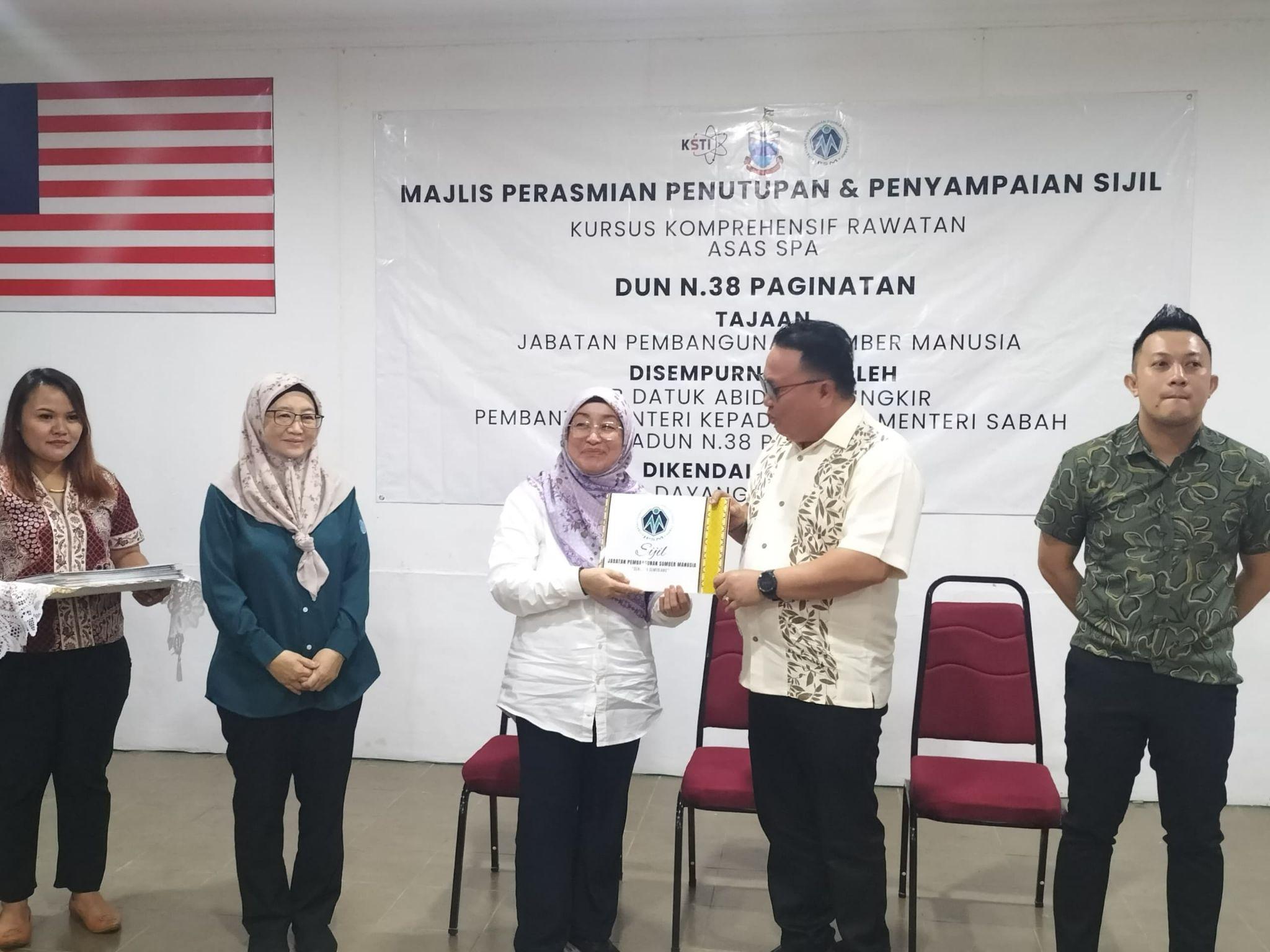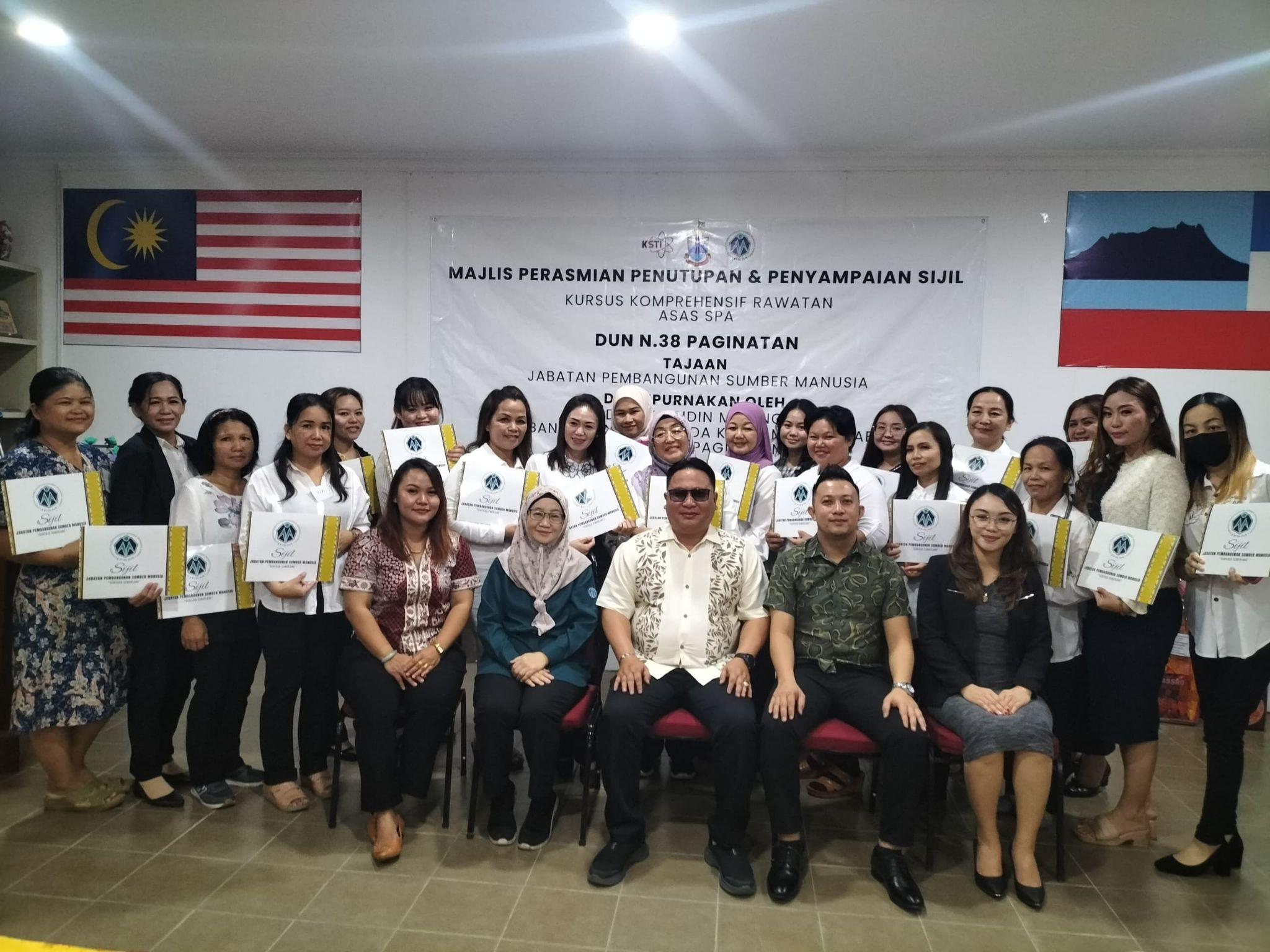 Majlis Perasmian Penutupan dan Penyampaian Sijil kepada 20 orang peserta bagi Kursus Komprehensif Rawatan Asas SPA yang telah disempurnakan oleh Tuan Hisyamudin Harun Pemimpin Pembangunan Masyarakat DUN N.38 Paginatan Ranau Bersama Rombongan Pemaju Mukim